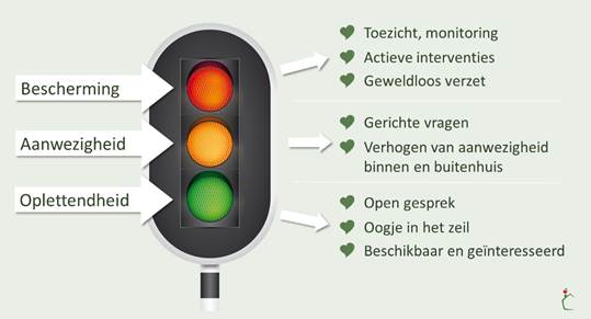 - Waakzame zorg: Er wordt onderscheid gemaakt tussen verschillende niveaus van zorg (groen, oranje, rood), afhankelijk van de situatie.